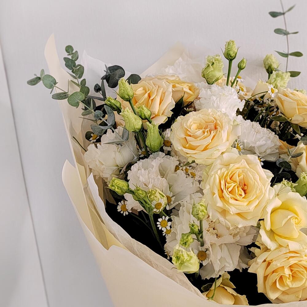 Роза кустовая – 4 шт.Гвоздика – 7 шт.Матрикария – 4 шт.Эустома – 4 шт.Эвкалипт – 3 шт.