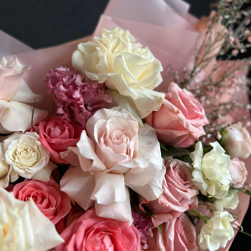 Одноголовая роза – 12 шт.Кустовая роза – 7 шт.эустома (лизиантус) – 3 шт.Гениста – 2 шт.декоративная упаковка – 1 шт.Атласная лента – 1 шт.