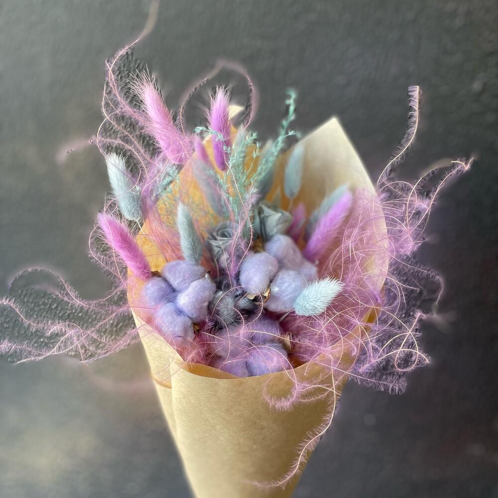 Хлопок – 3 шт.Лагурус – 17 шт.ковыль (пучок) – 3 шт.Крафт – 1 шт.роза стабилизированная пионовидная – 3 шт.