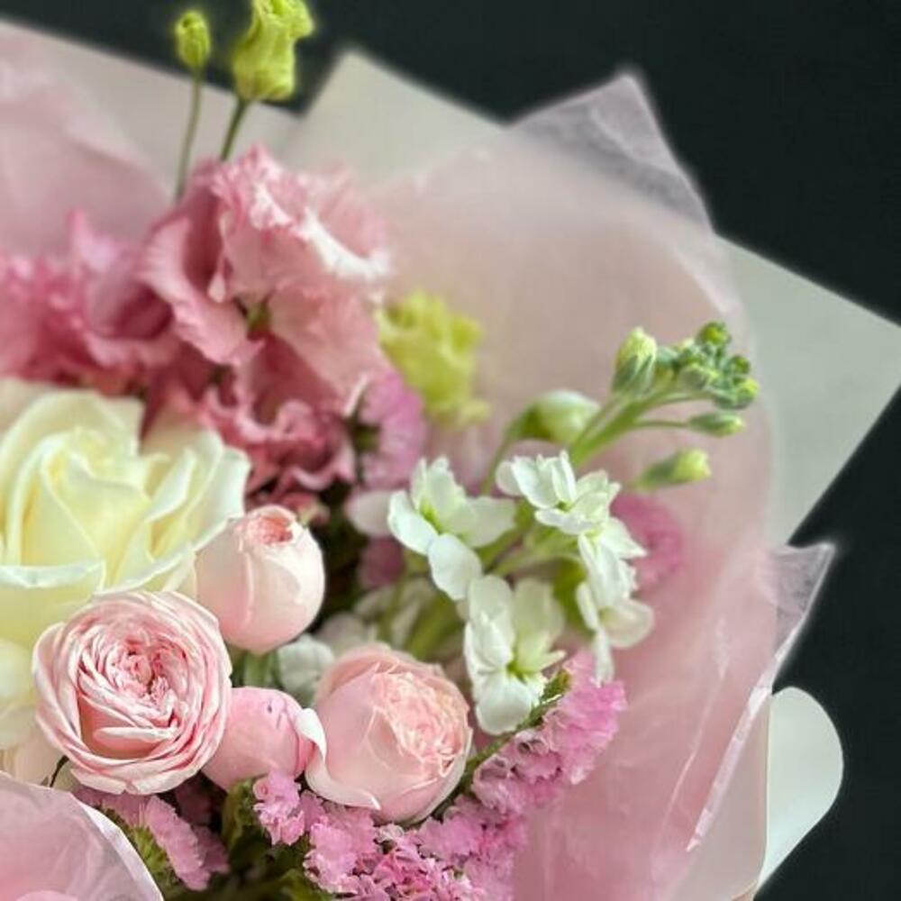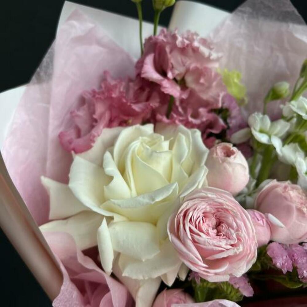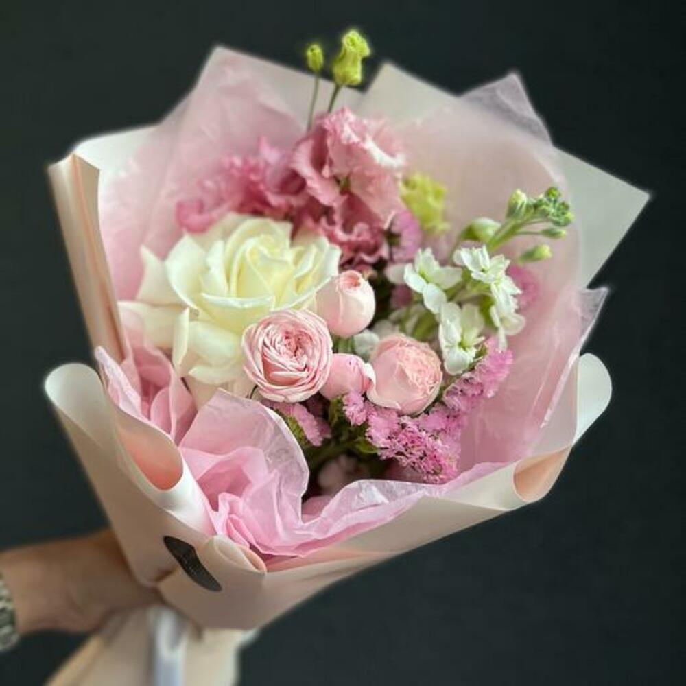 Маттиола – 1 шт.Статица – 1 шт.Кустовая пионовидная роза – 1 шт.Одноголовая роза – 1 шт.декоративная упаковка – 1 шт.Атласная лента – 1 шт.