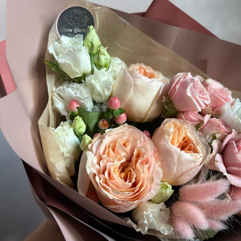 Пионовидная одноголовая роза – 2 шт.Гиперикум – 1 шт.Лизиантус (эустома) – 2 шт.Кустовая роза пионовидная – 2 шт.Роза одноголовая – 1 шт.Лагурус (сухоцвет) – 5 шт.декоративная упаковка – 1 шт.Атласная лента – 1 шт.