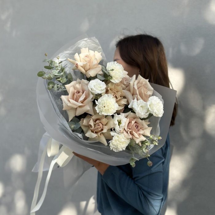 Лизиантус – 1 шт. Эвкалипт – 2 шт. Роза – 7 шт. Гвоздика – 3 шт.