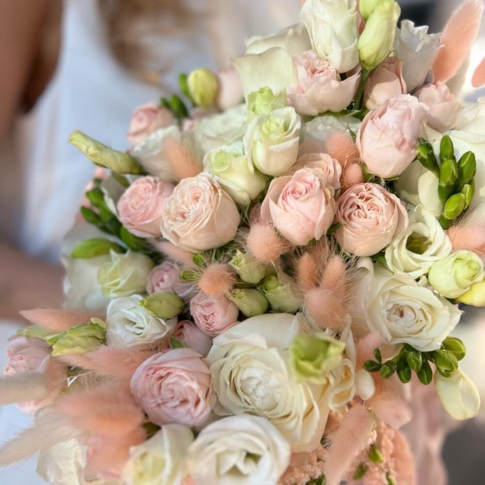 Пионовидная роза – 5 шт.Кустовая пионовидная роза – 11 шт.Лизиантус – 5 шт.фрезии – 5 шт.Лагурус – 30 шт.амарант стабилизированный – 1 шт.Лента атласная – 3 шт.