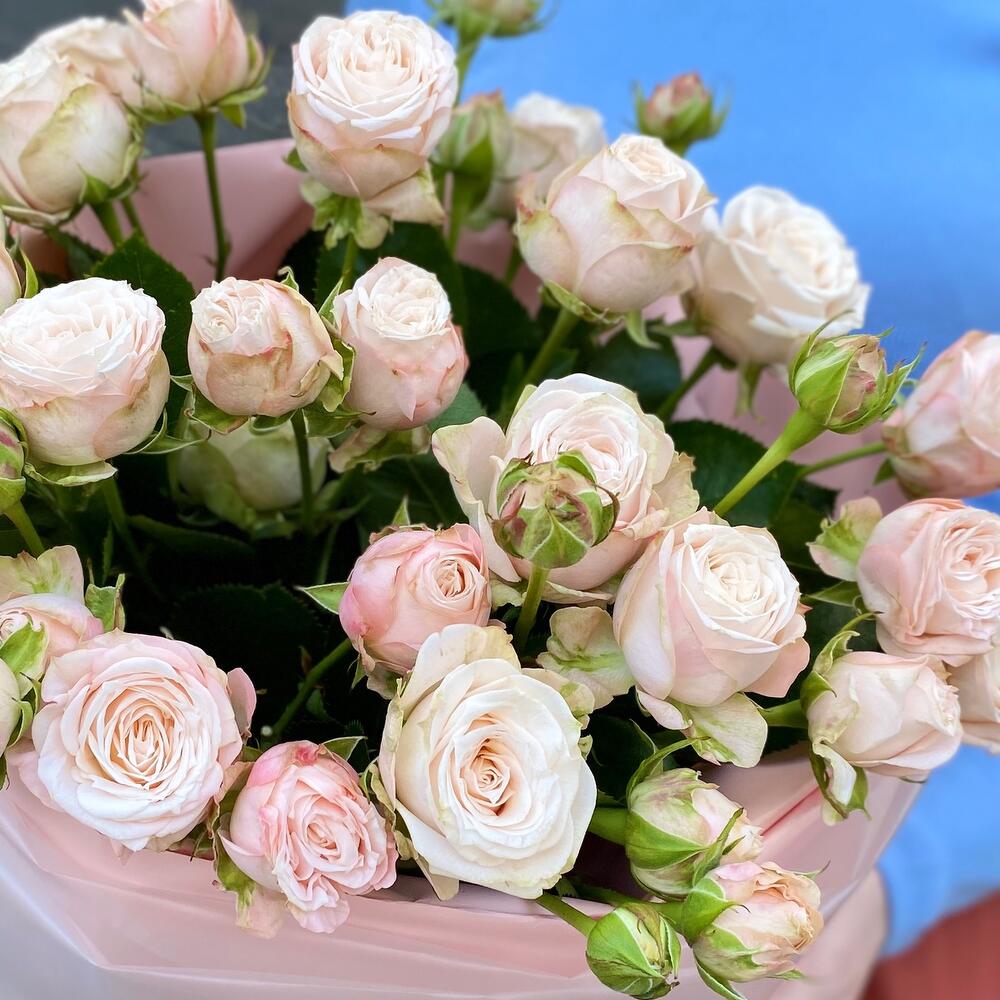 Лента атласная – 1 шт.Кустовая пионовидная роза – 15 шт.Упаковка дизайнерская – 2 шт.