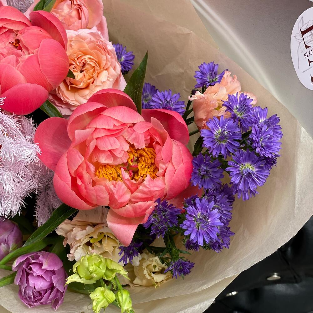Лизиантус – 1 шт.Гвоздика – 3 шт.Лента атласная – 2 шт.Тишью – 2 шт.Аспарагус – 2 шт.Тюльпан пионовидный – 3 шт.Упаковка дизайнерская – 2 шт.Пионовидная роза кустовая – 1 шт.Фисташка пучок – 2 шт.Астра кустовая – 2 шт.Пион коралл шарм – 2 шт.