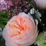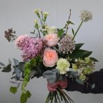 Букет с сиренью, луком и пионовидными розами