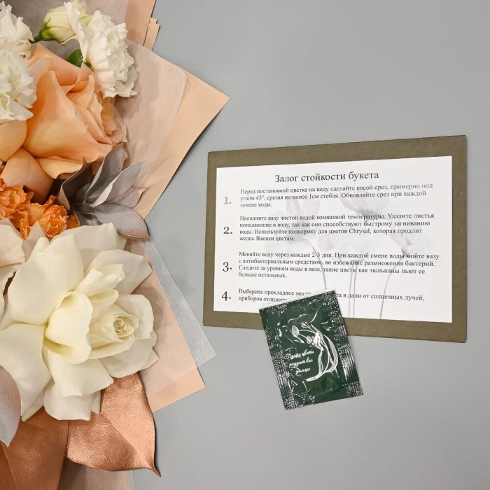 - Сроки возврата: Претензии по качеству букета принимаются в течение 24 часов с момента его получения.