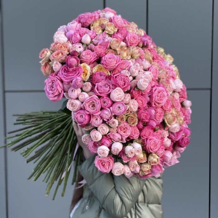 Кустовая роза пионовидная – 101 шт. Открыточка с вашими пожеланиями – 1 шт. Атласная лента – 1 шт.