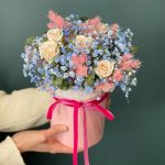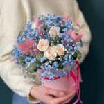 Цветочная композиция в шляпной коробке с голубой гипсофилой “Майолика”