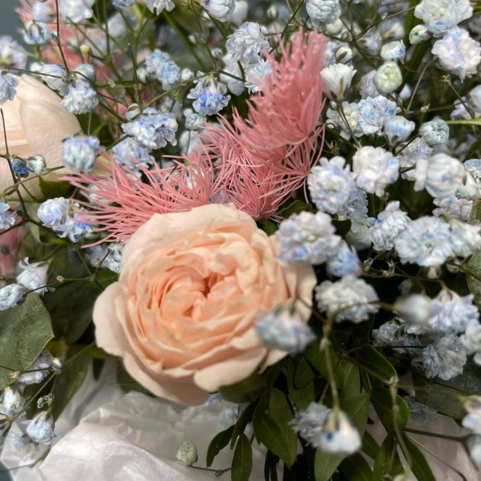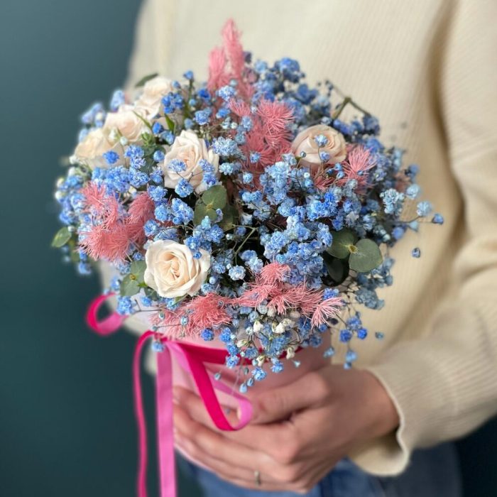 Цветочная композиция в шляпной коробке с голубой гипсофилой “Майолика”