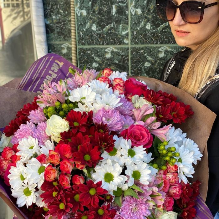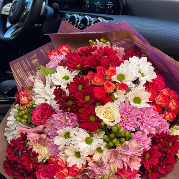 Гиперикум – 3 шт. Роза розовая – 5 шт. Роза белая – 5 шт. Роза кустовая розовая – 5 шт. Альстромерия розовая – 5 шт. Хризантема красная – 5 шт. Хризантема розовая – 5 шт. Упаковка дизайнерская – 1 шт. Хризантема белая – 5 шт.