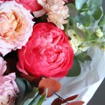 Пион Голландия – 6 шт.Львиный зев – 6 шт.Маттиола – 6 шт.Роза пионовидная – 7 шт.Роза пионовидная кустовая – 3 шт.Гвоздика – 5 шт.Эвкалипт – 9 шт.Бумага – 3 шт.Лента атласная – 2 шт.