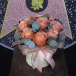 Роза пионовидная кахала – 9 шт.Эвкалипт – 3 шт.Оазис флористический – 1 шт.Пленка дизайнерская – 2 шт.Шляпная коробка – 1 шт.