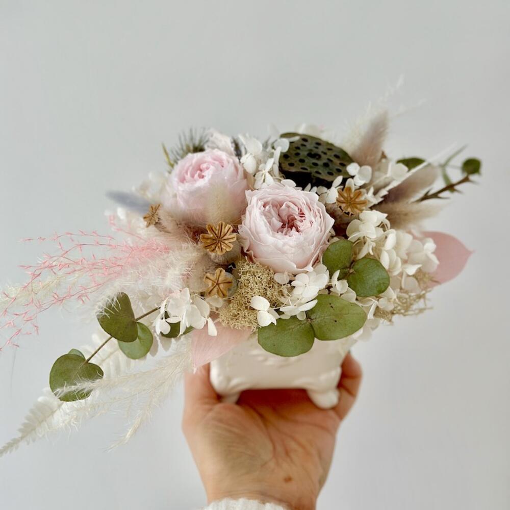 Композиция из стабилизированных цветов в кашпо Антик