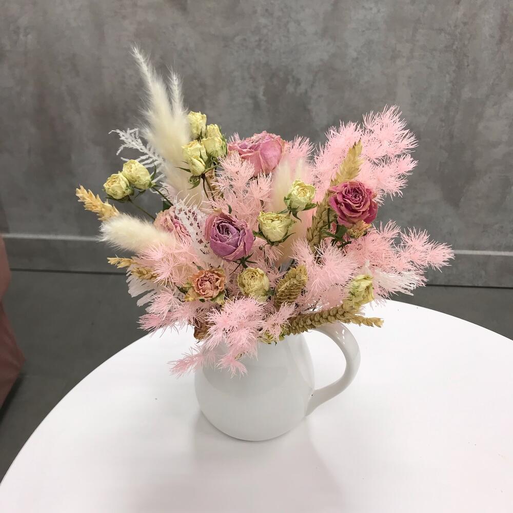 кувшин керамика – 1 шт.Оазис флористический – 1 шт.камыш сухоцвет – 1 шт.роза кустовая засушенная – 5 шт.Колосья – 9 шт.аспарагус стабилизированный – 3 шт.листья стабилизированные – 1 шт.