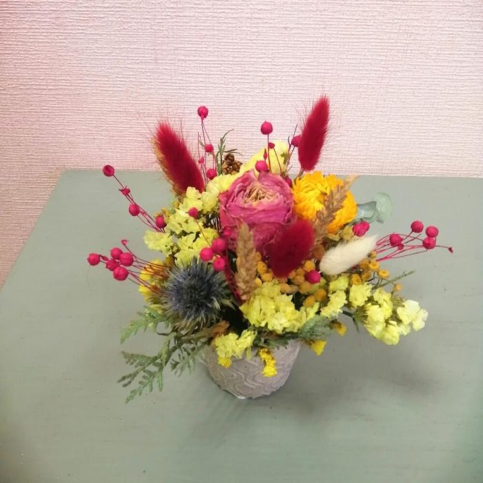 Лагурус – 5 шт.Роза сухоцвет – 2 шт.Гелихризум – 1 шт.лен сухоцвет – 1 шт.Рожь – 3 шт.Статица – 1 шт.кипарисовик – 1 шт.Оазис флористический – 1 шт.Кашпо керамическое – 1 шт.