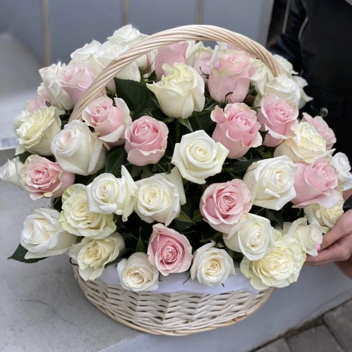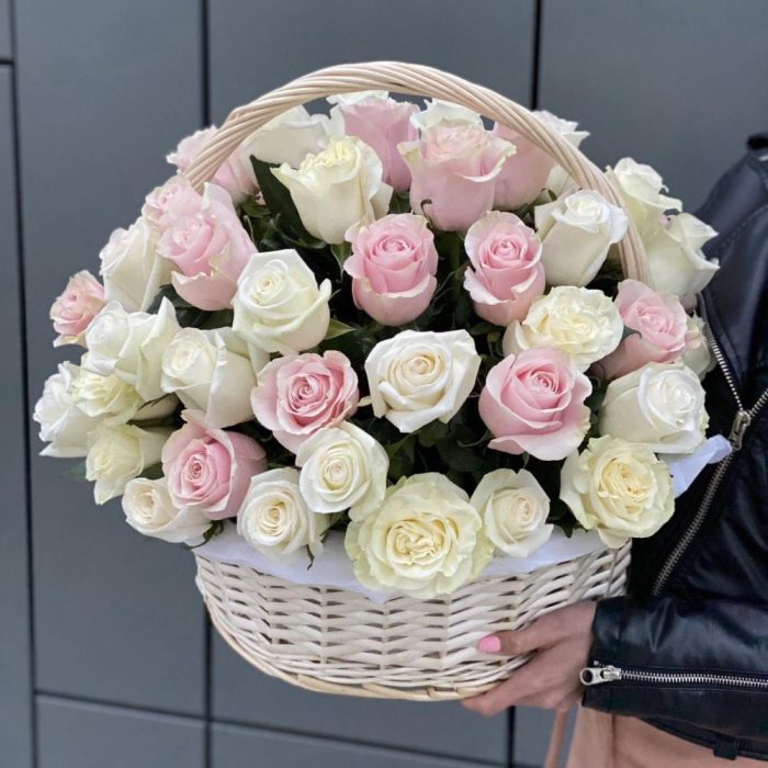 Корзина из 65 белых и розовых роз!
