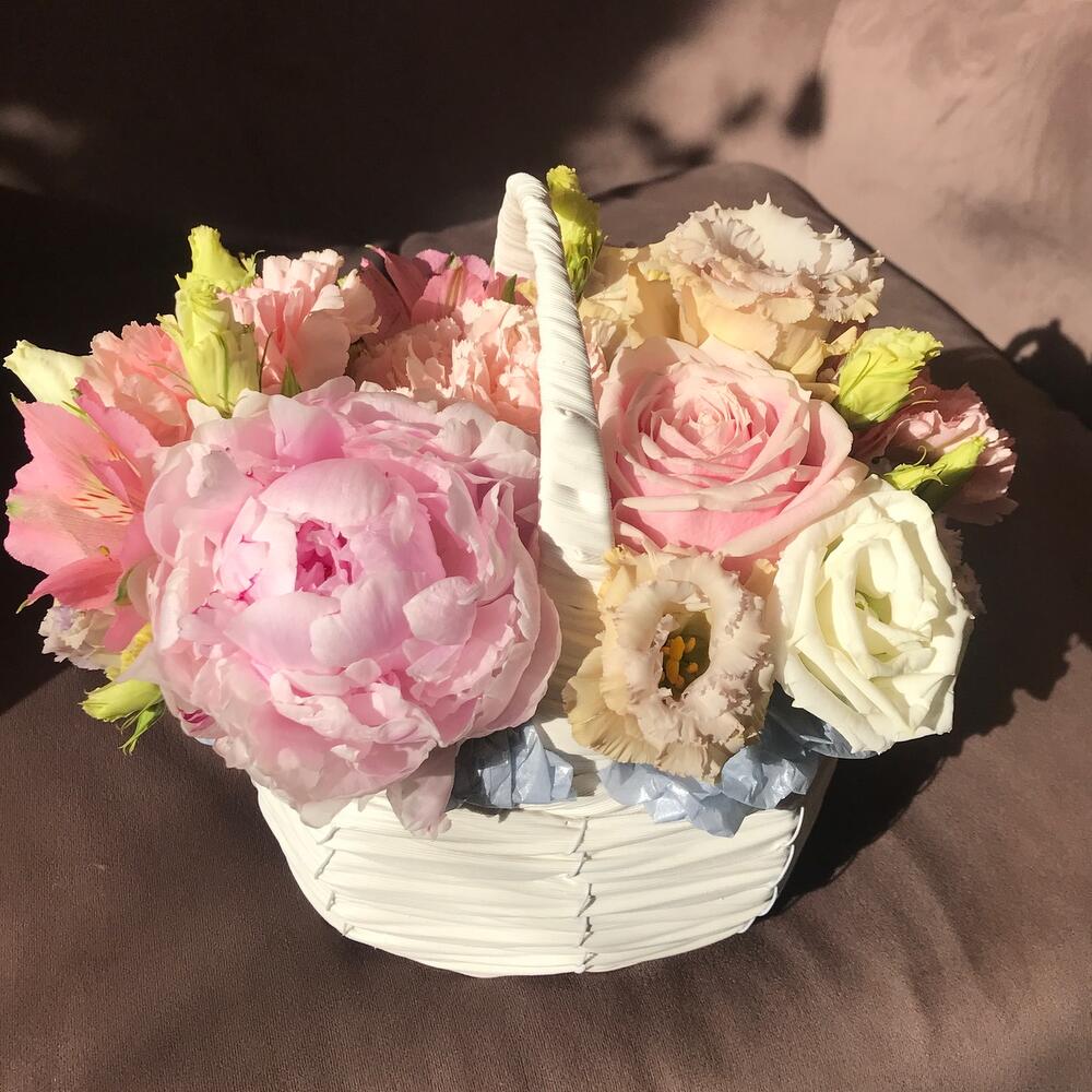 Корзина плетеная – 1 шт.Губка флористическая – 1 шт.Пион Сара Бернар – 1 шт.Роза розовая – 1 шт.Эустома – 2 шт.Гвоздика – 5 шт.