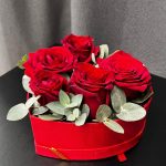 Красные розы в Коробке Сердце с Эвкалиптом