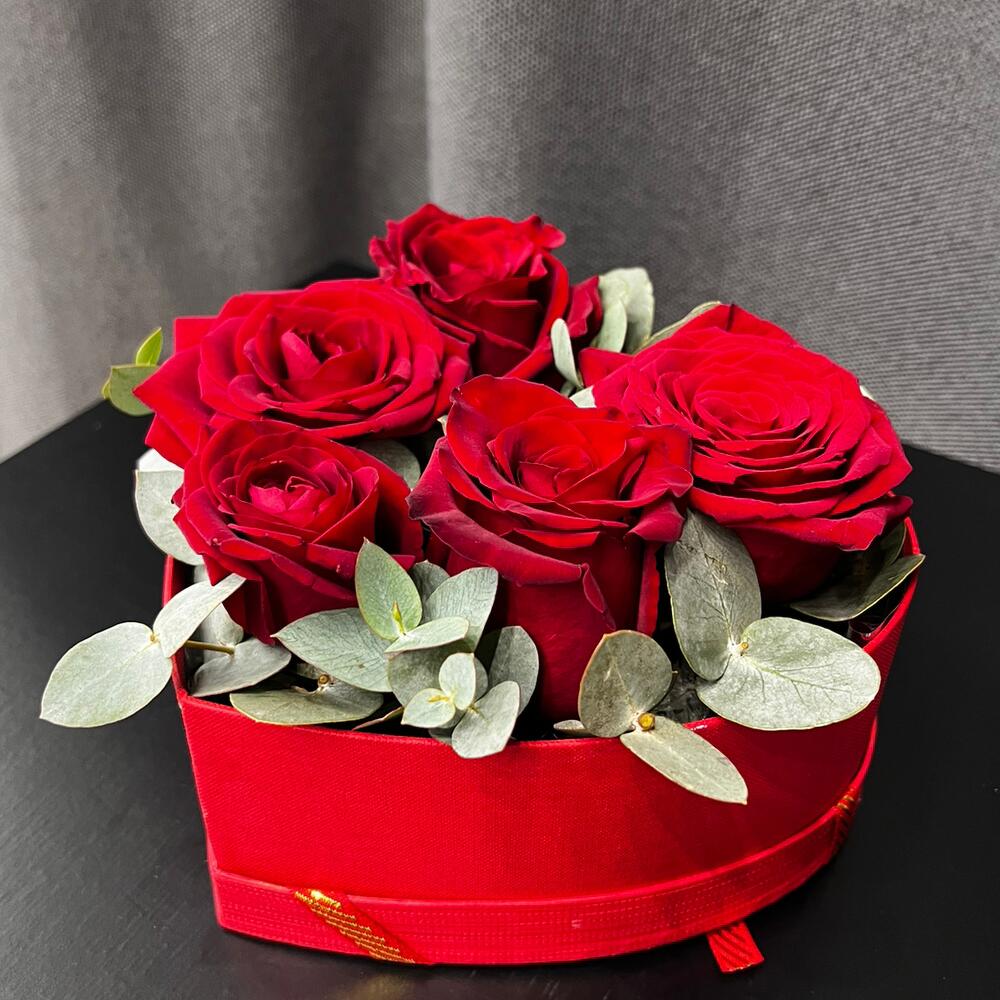 Роза красная – 5 шт.Эвкалипт – 1 шт.Оазис – 1 шт.Коробка сердце – 1 шт.