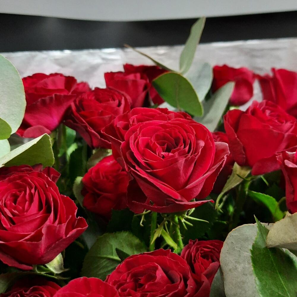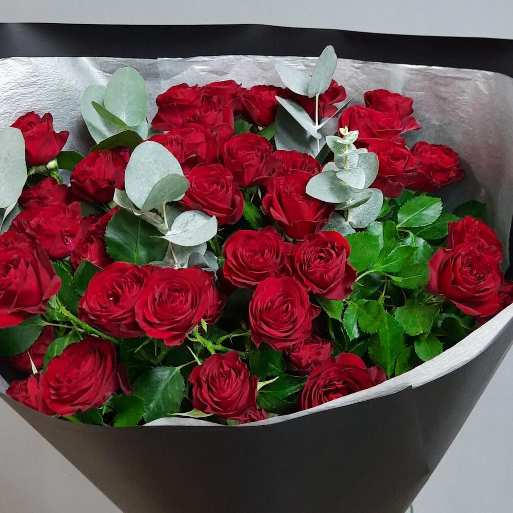 Эвкалипт – 2 шт.Упаковка дизайнерская – 2 шт.Роза кустовая 60 см – 10 шт.