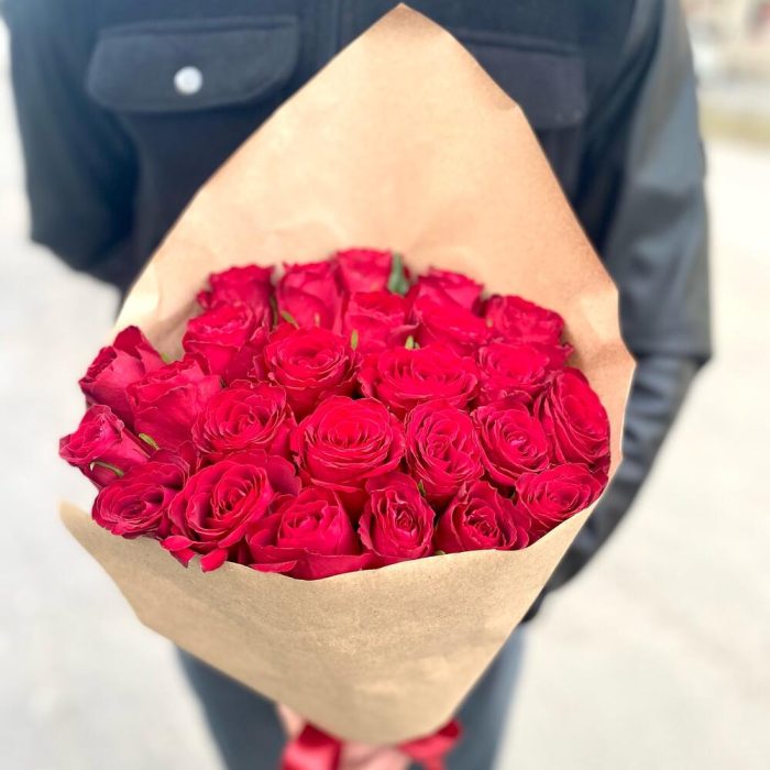 Роза красная – 25 шт.Крафт упаковка – 1 шт.Лента атласная – 1 шт.