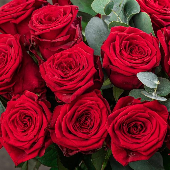 Монобукет из красных роз с эвкалиптом в вазе-букетнице