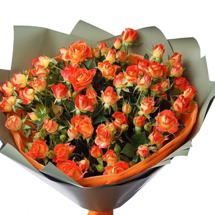 оранжевые кустовые розы – 13 шт. Открыточка с вашими пожеланиями – 1 шт. Упаковка дизайнерская – 3 шт.