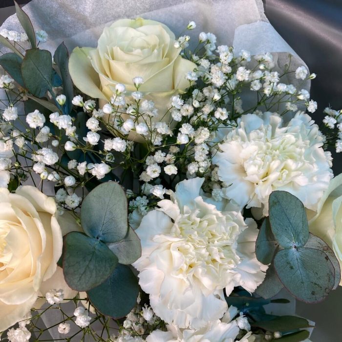 Упаковка дизайнерская – 4 шт.Роза Мондиаль – 3 шт.гипсофила белая ветка – 3 шт.диантус аврора – 4 шт.эвкалипт ценария ветка – 1 шт.