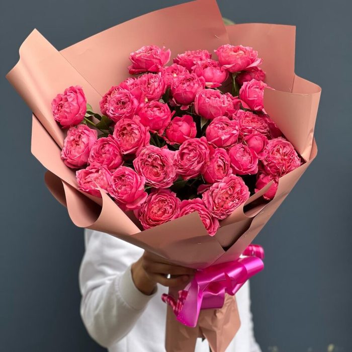 Зелень – 10 шт. Лента атласная – 1 шт. Роза пионовидная кустовая – 9 шт. Упаковка дизайнерская – 8 шт.