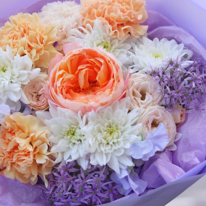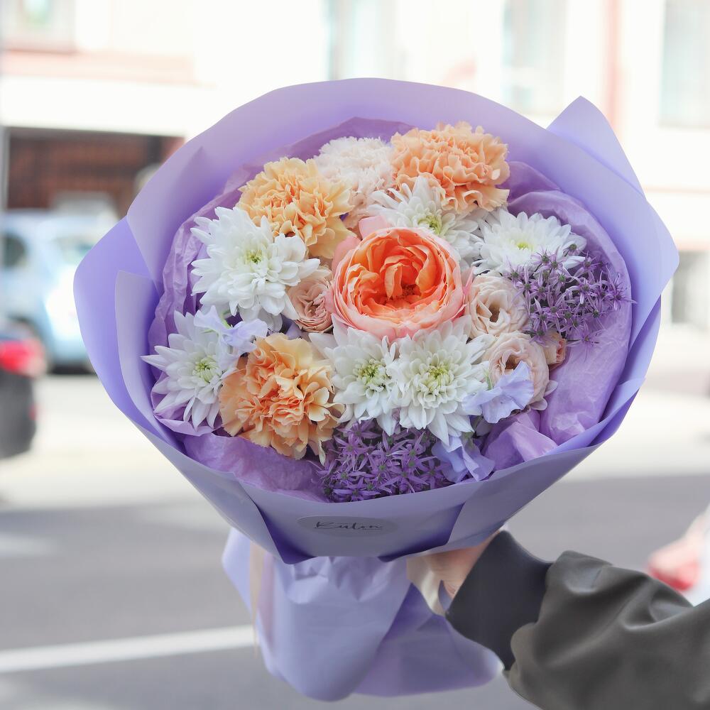 Латирус – 2 шт.Роза кустовая – 2 шт.Хризантема кустовая – 2 шт.Гвоздика – 4 шт.Аллиум – 1 шт.Открыточка с вашими пожеланиями – 1 шт.Шоколадка – 1 шт.Дизайнерская упаковка – 1 шт.роза садовая айко – 1 шт.