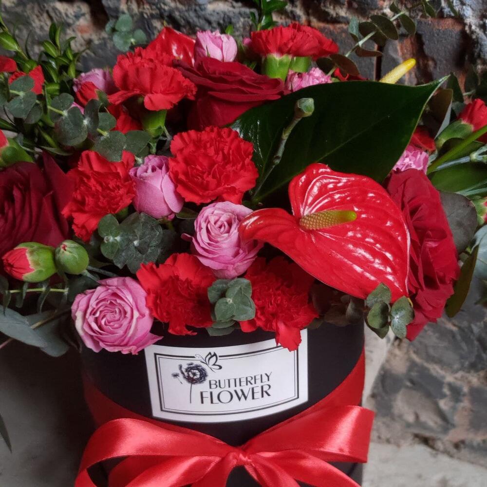 Шляпная коробка с розами, гвоздикой, гипсофилой и антуриумом "Kenzo box"