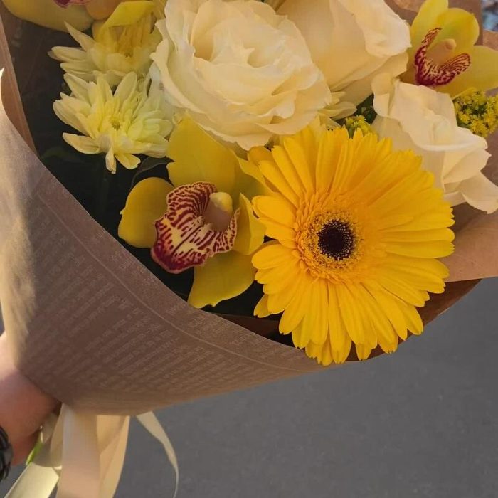 Гербера – 2 шт.Орхидея Цимбидиум – 3 шт.Рускус – 5 шт.Роза Эквадор – 3 шт.Солидаго – 3 шт.Хризантема кустовая – 2 шт.Упаковка дизайнерская – 5 шт.Лента атласная – 1 шт.