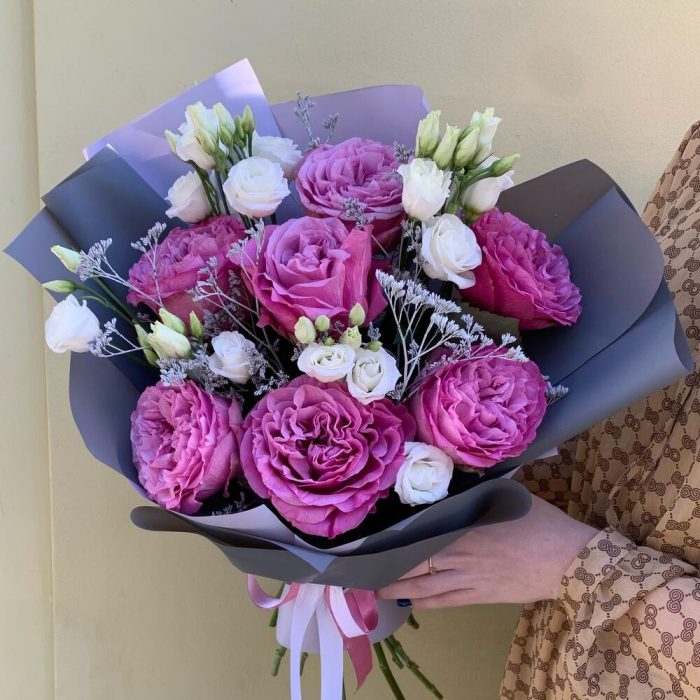 ЯГОДНОЕ МОРОЖЕНОЕ премиум букет с белой эустомой и пионовидными розами