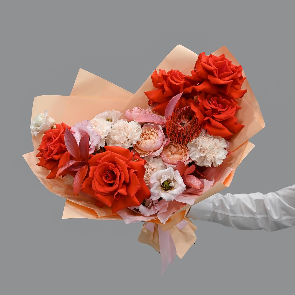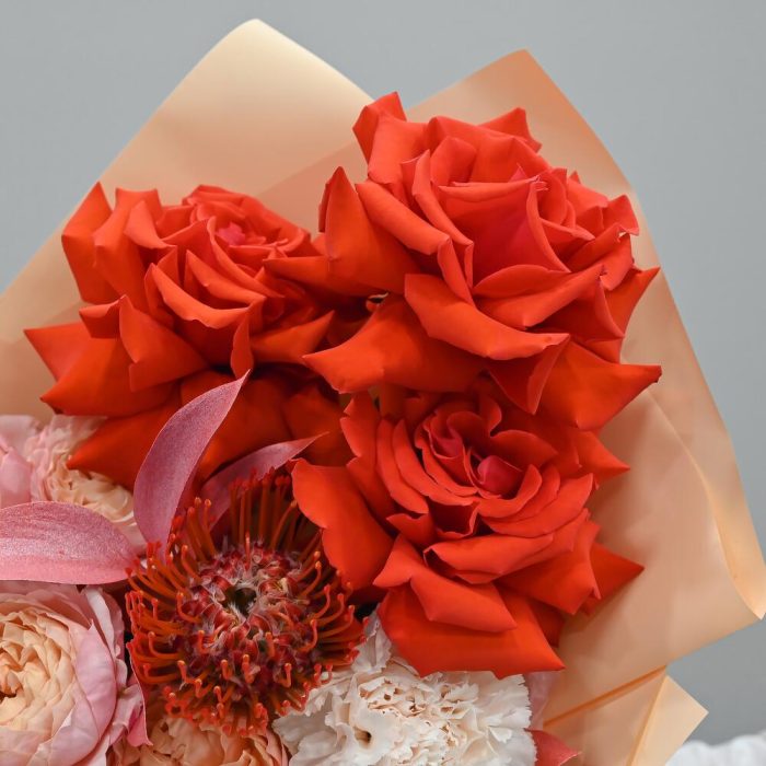 Яркий букет в красно персиковой цветовой гамме. В составе французские розы, пионовидная кустовая роза, гвоздика, леукоспермум и лизиантус.Флористы студии Цветочный Этикет собрали его из самых свежих цветов, тщательно продумав состав. Букет готов удивлять красотой своего … Показать ещёполучателя! Станет идеальным подарком для любимой женщины, дочке или мамы, на День Рождения, юбилей, свадьбу и другие торжественные мероприятия. С букетом вы получите конверт с открыткой, в которой мы напишем любое пожелание, инструкцию свежести и средство для продления жизни срезанных цветов.