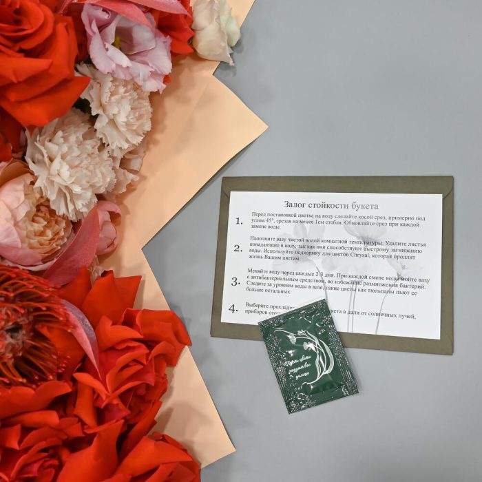 - Сроки возврата: Претензии по качеству букета принимаются в течение 24 часов с момента его получения.