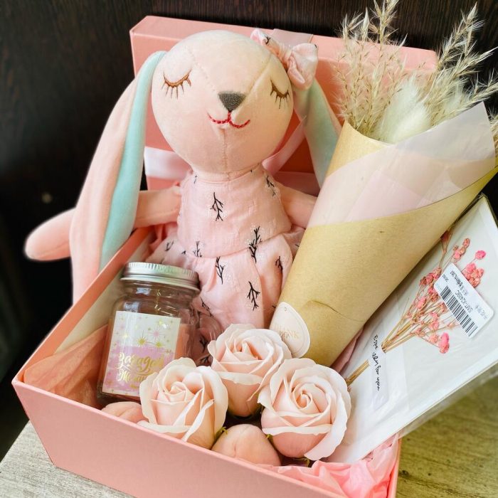 Коробка – 1 шт.Заяц плюшевый – 1 шт.открытка дизайнерская – 1 шт.свечи ароматические – 1 шт.букет из сухоцветов – 1 шт.роза мыльная – 3 шт.