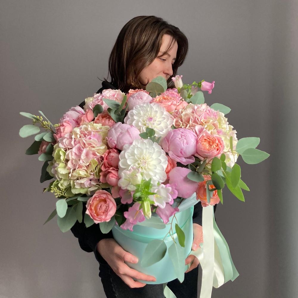 Жемчуга – Шляпная коробка с пионами, гортензиями и пионовидными розами