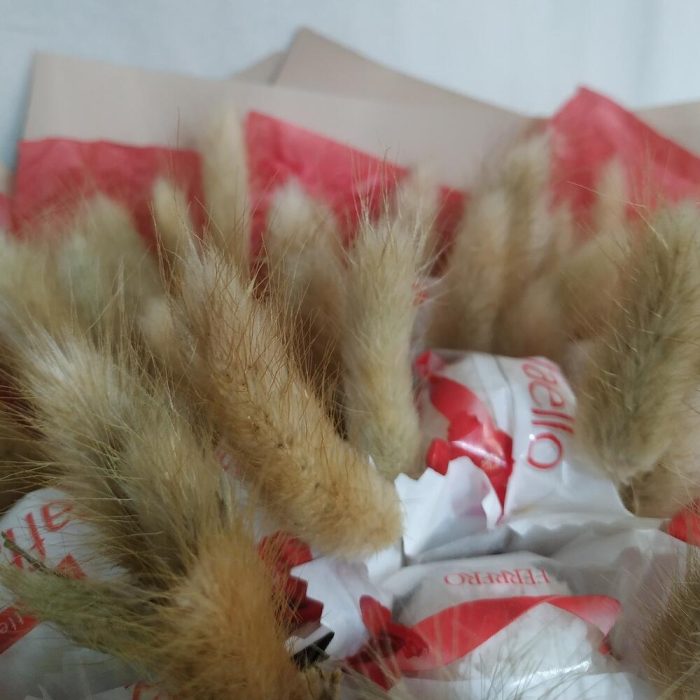Raffaello конфеты – 19 шт.Лагурус – 50 шт.Тишью – 1 шт.Бумага – 1 шт.Лента – 1 шт.