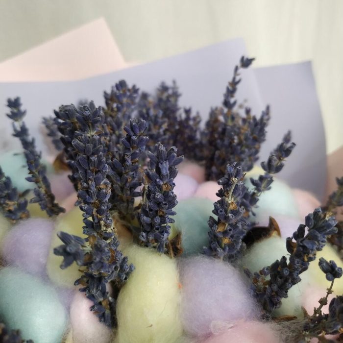 «Лавандовое созвездие» Букет из розы, гвоздики, статица и хлопка