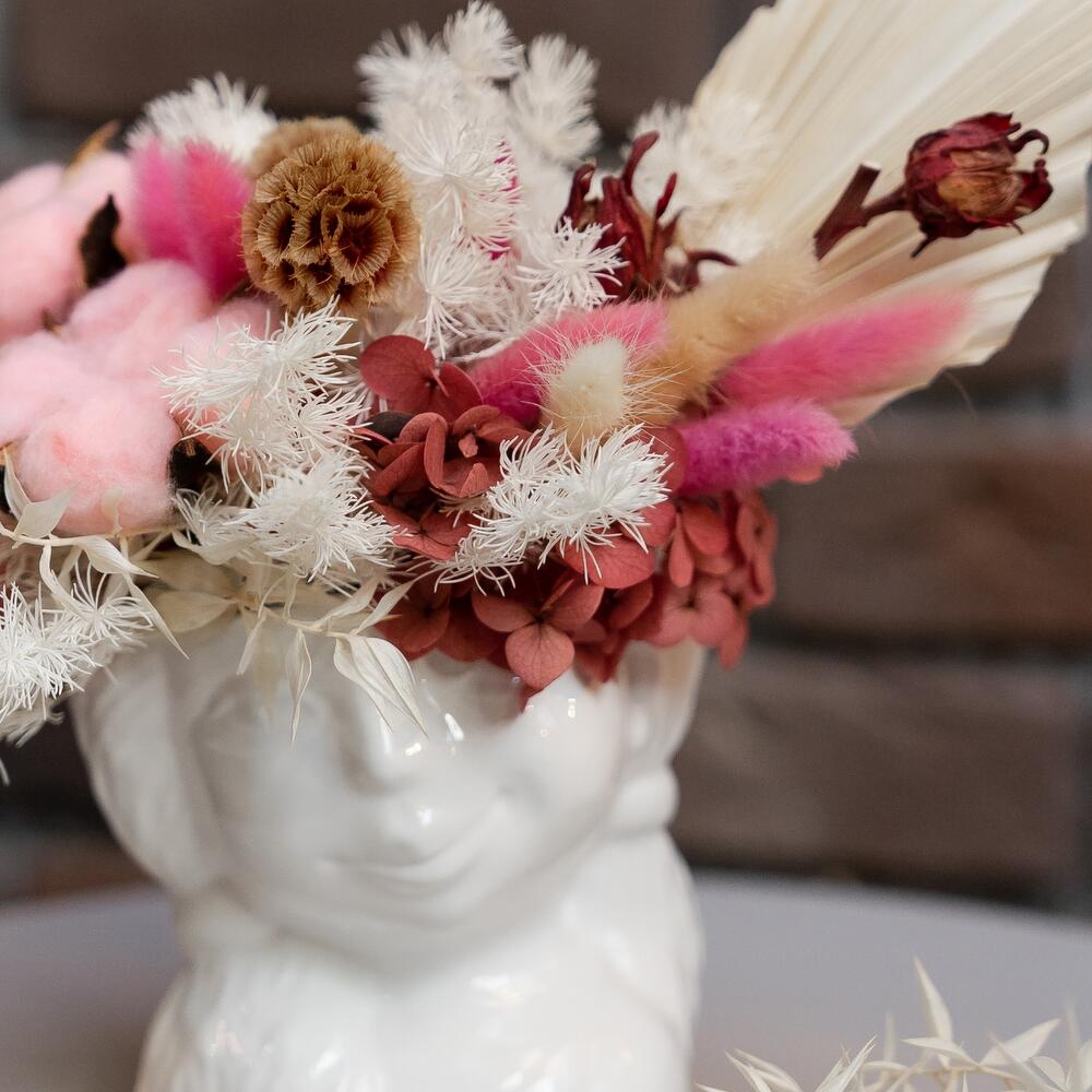 Хлопок натуральный – 2 шт.Скабиоза – 3 шт.Лагурус (сухоцвет) – 15 шт.аспарагус стабилизированный – 4 шт.гортензия стабилизированная – 1 шт.пальма сухоцвет – 1 шт.Кашпо керамическое – 1 шт.