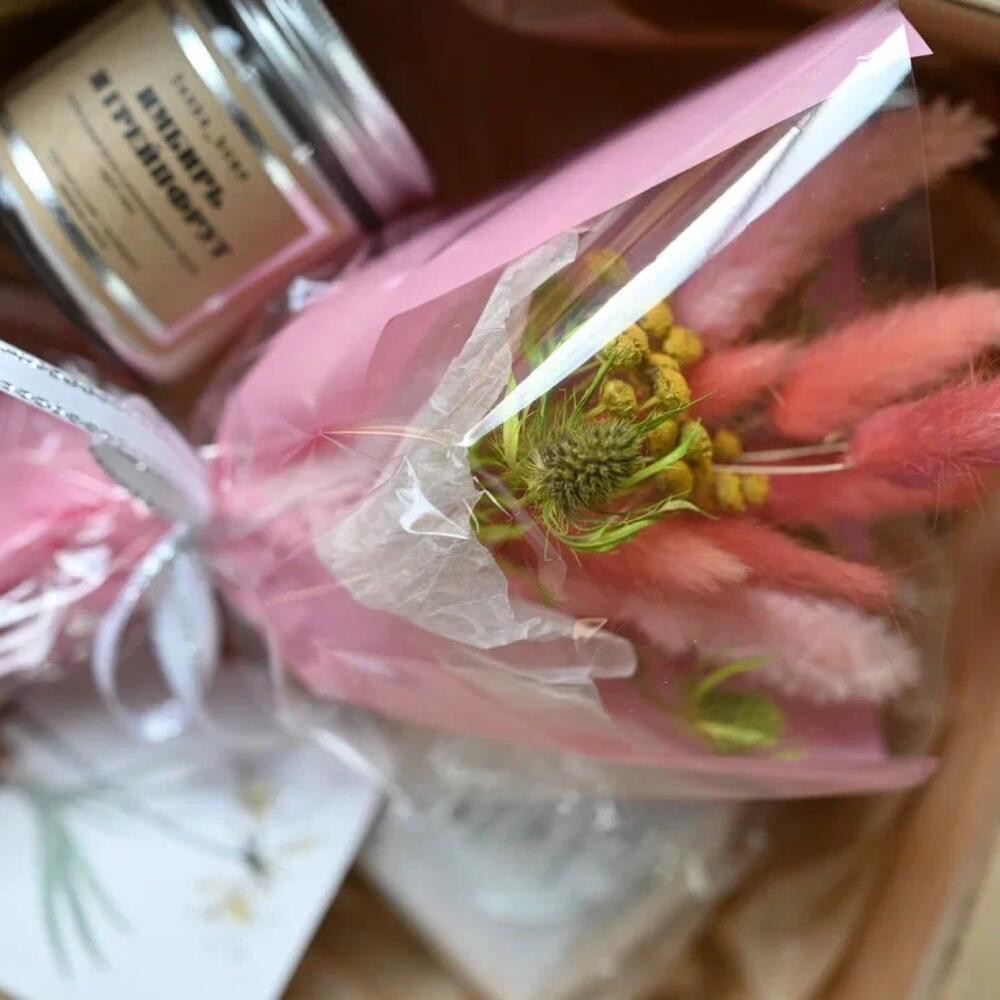 Ящик деревянный – 1 шт.Наполнитель бумажный – 1 шт.свеча из соевого воска – 1 шт.букетик из сухоцветов – 1 шт.бомбочка для ванной ручной работы – 1 шт.Открытка – 1 шт.