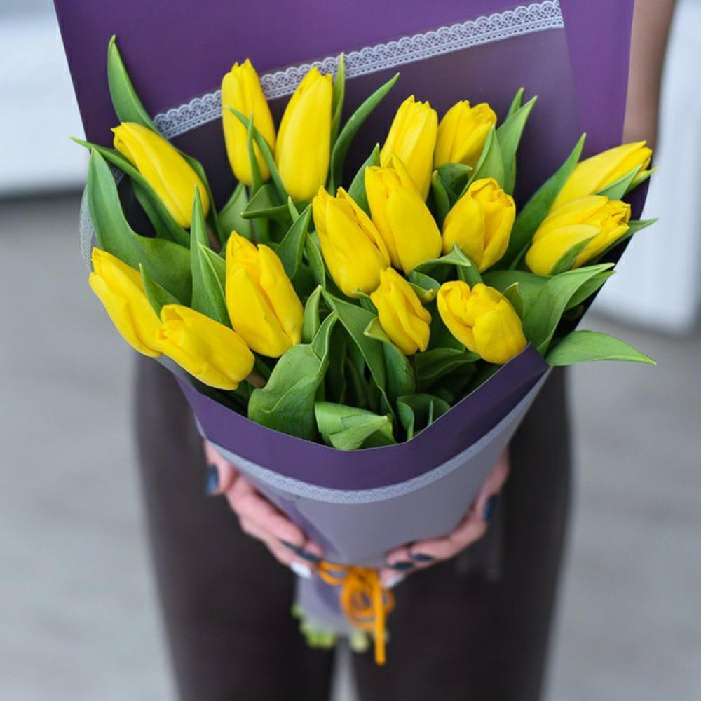 Букет из 15 жёлтых тюльпанов в дизайнерской упаковке